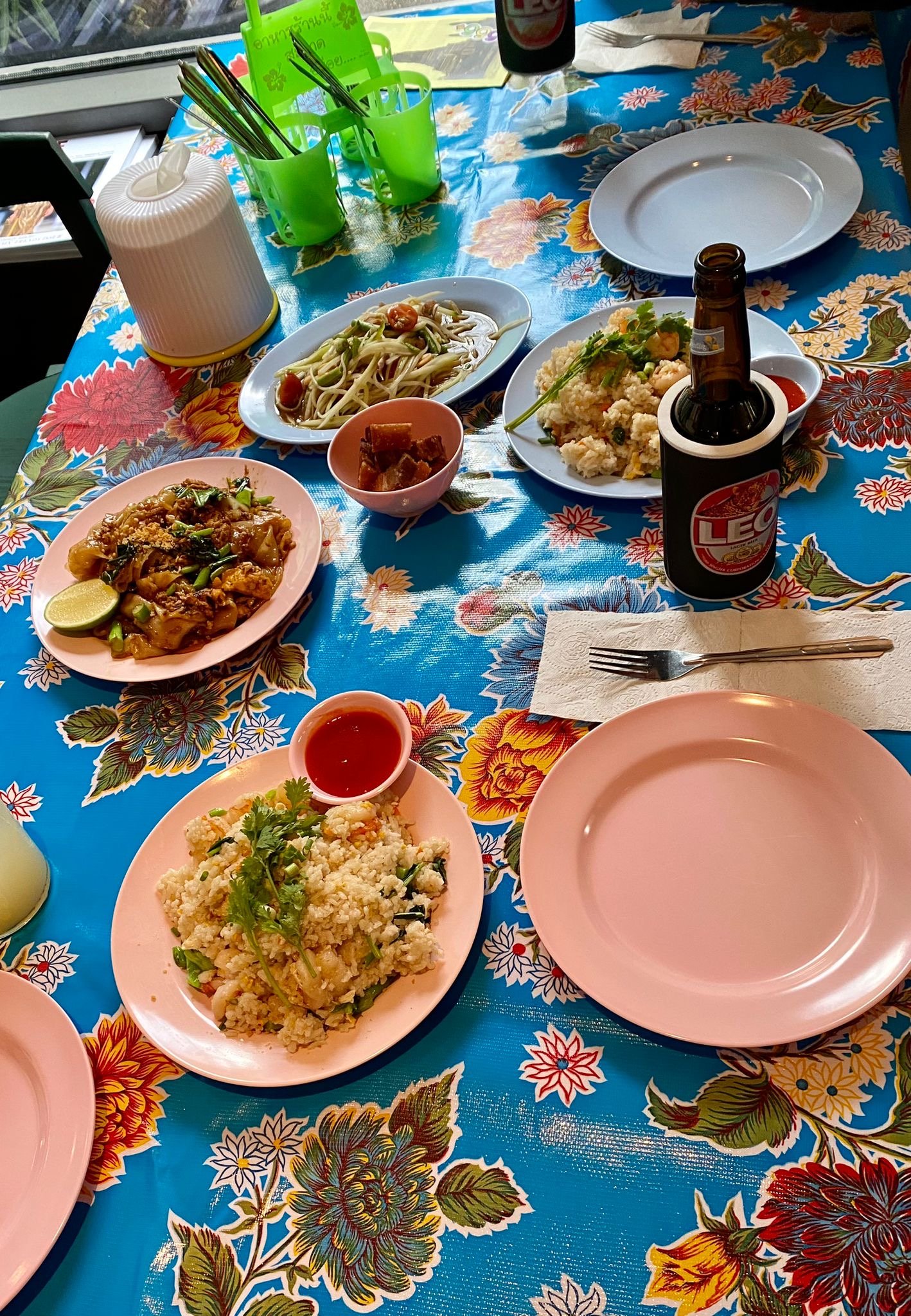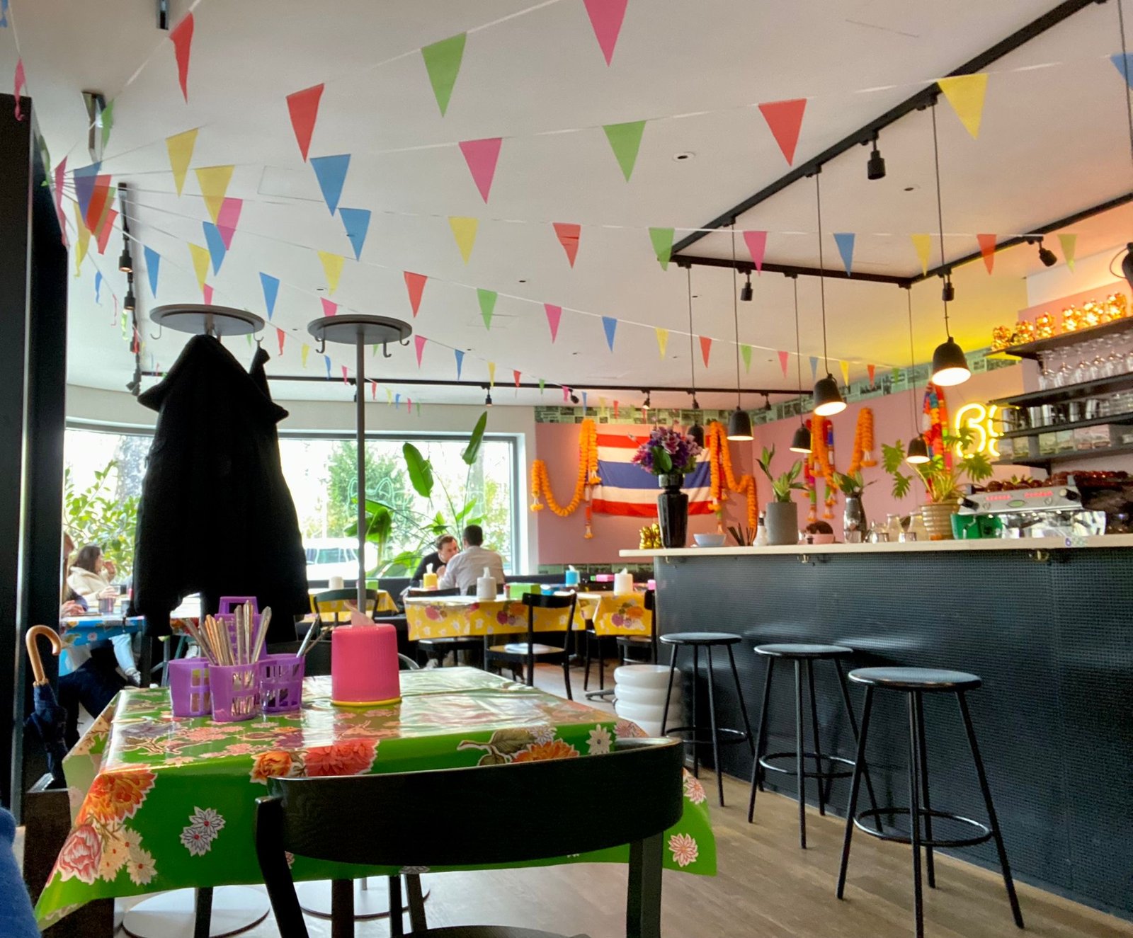 The moment you walk into the restaurant, it feels like a little trip to Bangkok. Colorful plastic tablecloths, vibrant plates, napkin holders on the tables, and an intentionally casual atmosphere instantly remind you of Thai street food markets. That is exactly what makes it so charming. It feels playful, lively, and at the same time incredibly authentic.