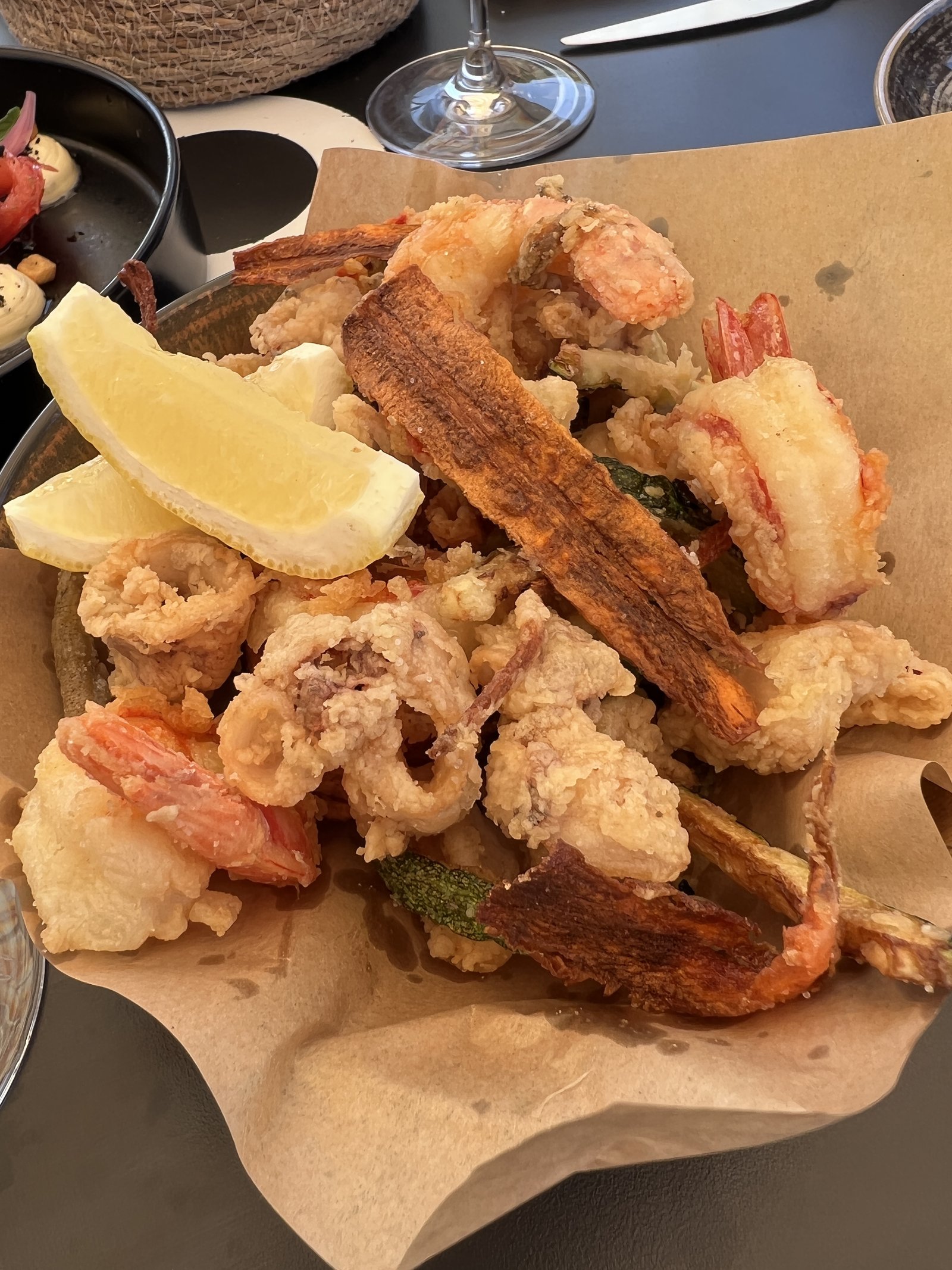 Fritto misto - Frittierte Crevetten, Calamari, Acquadelle, Zucchini, Karotten