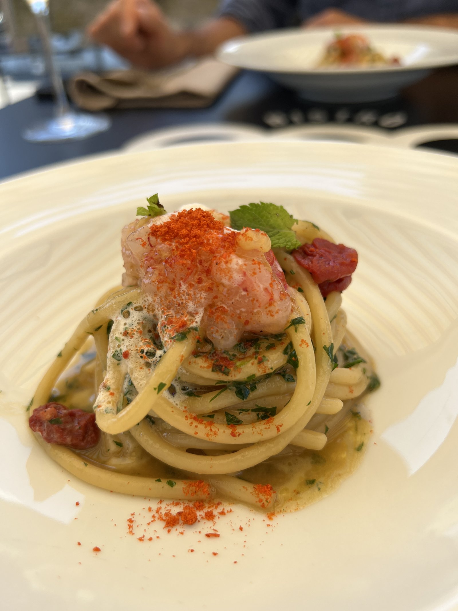 Spaghettoni al gambero rosso di Mazara del Vallo, menta e agrumi - Spaghettoni mit roten Crevetten aus Mazara del Vallo, Minz, Zitrus