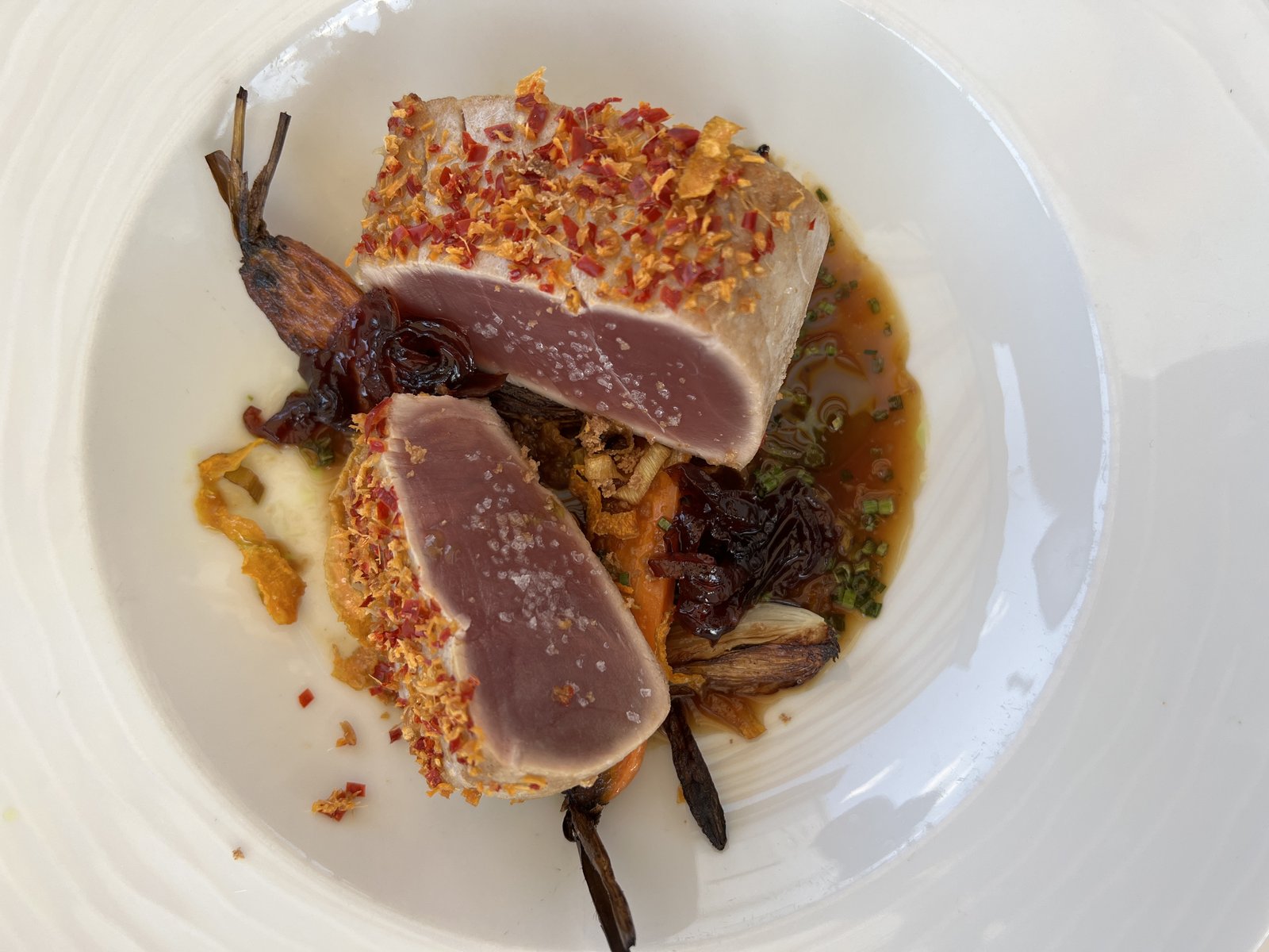 Tonno rosso, marmellata di cipolle e verdure estive - Roter Tuhnfisch, Zwiebelmarmelade, Sommergemüse