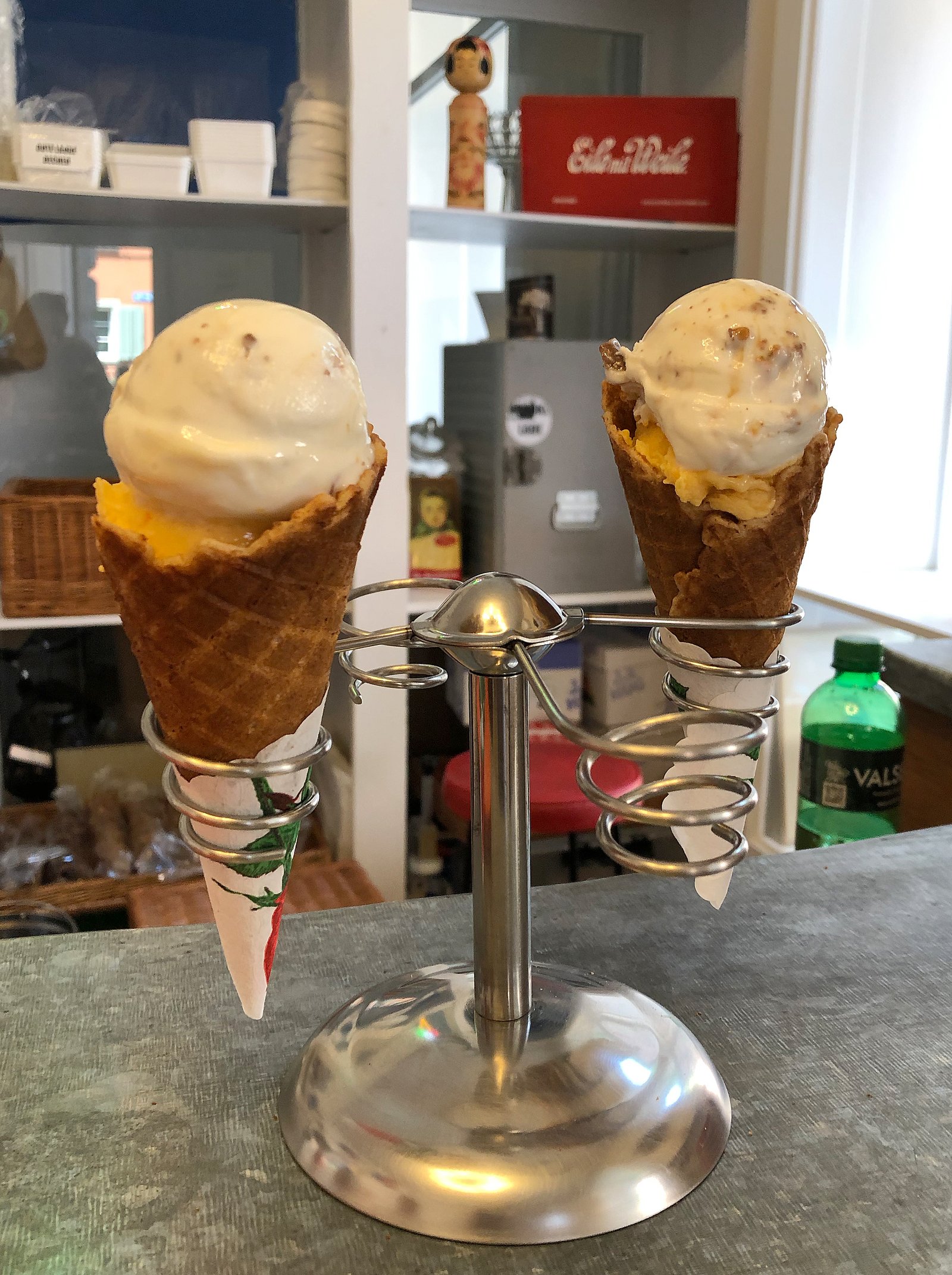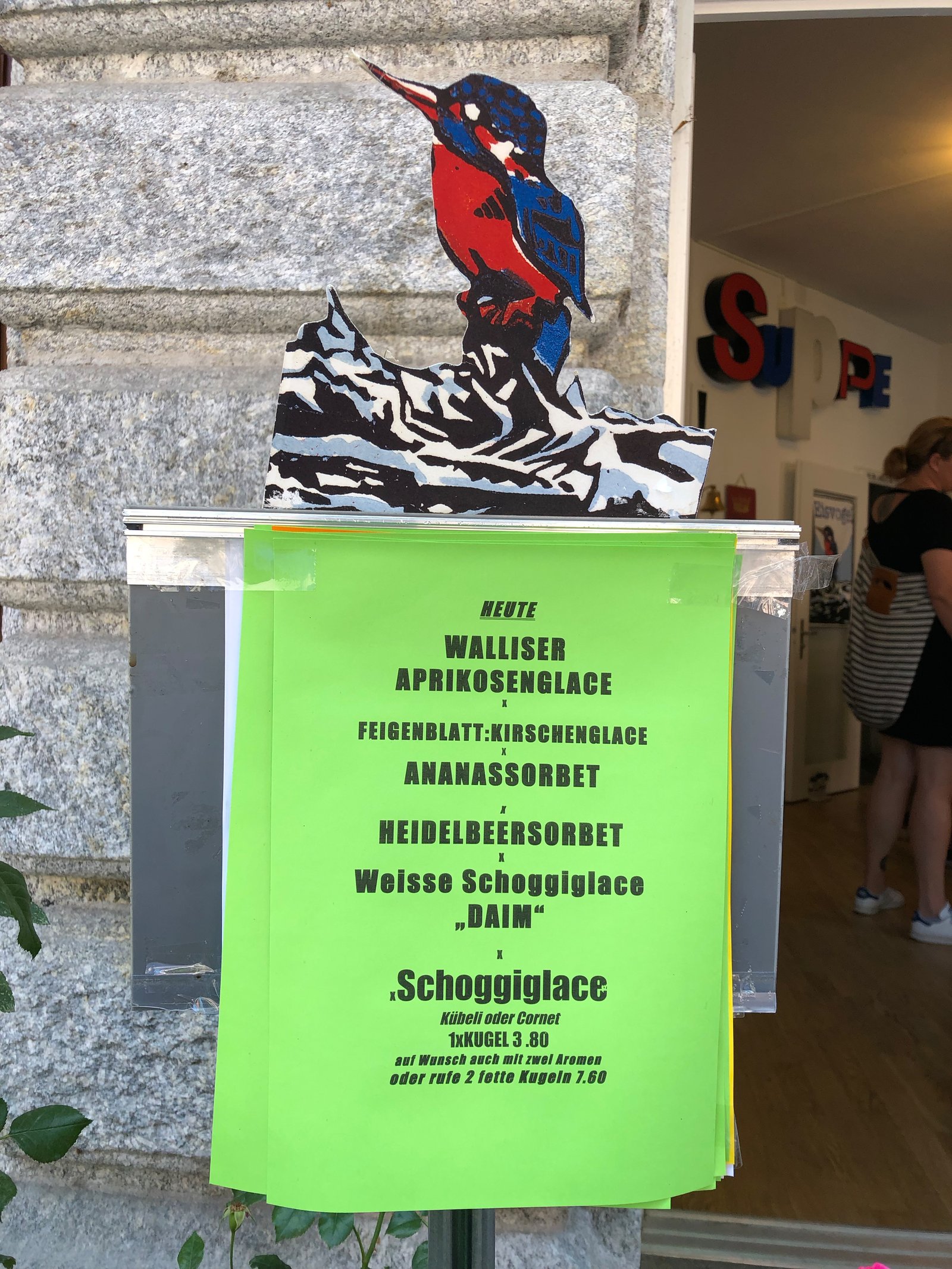 5 Sterne für Tine Giacobbos Eisvogel Kreationen. Täglich frisch werden diese in ihrer Gelateria mit saisonalen Zutaten zubereitet. Bis auf Schoggisorbet, das speziell für die Kinder immer erhältlich ist, sind die anderen 5 Sorten jeweils eine Überraschung. Da der Andrang gross ist, kann es sein, dass bereits am späten Nachmittag alles ausverkauft ist. Es hät solangs hätt! Der Preis ist ebenfalls sehr fair. CHF 4.50 für bis zu zwei Kugeln.