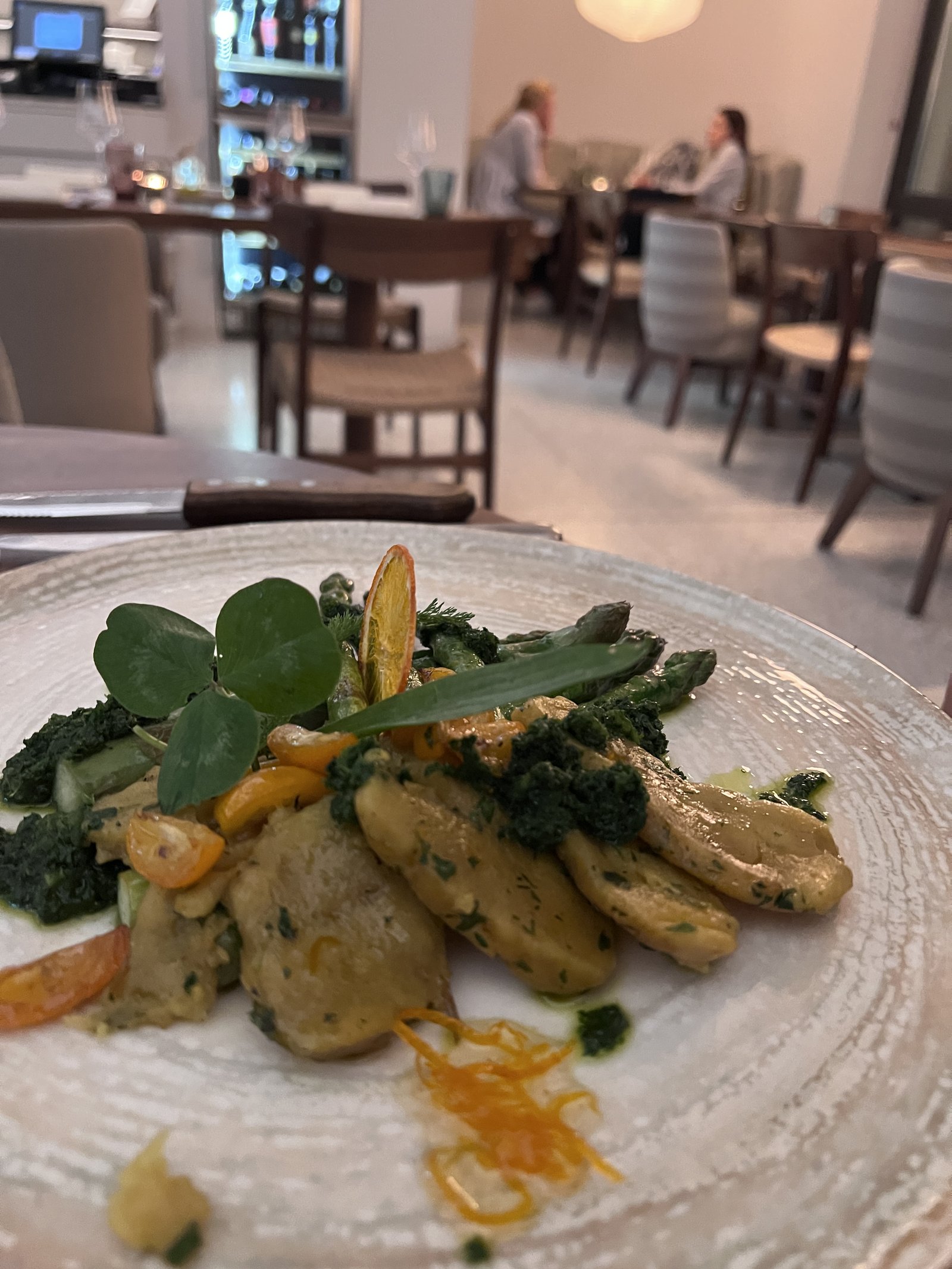Hausgemachter Seitan mit grillierten grünen Spargeln, Kumquat und Kräuteröl