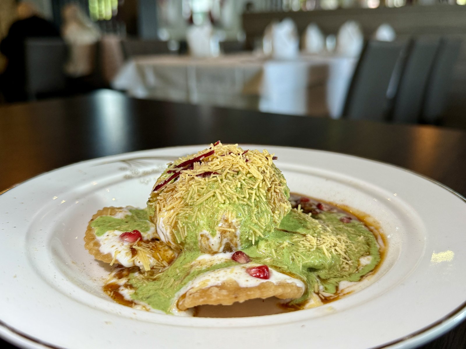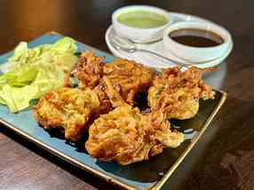 „Tikki Papdichaat“ – ein typischer Streetfood-Snack, den es in Indien an jeder Straßenecke gibt. Auch „Pahadi Bhajia“ gehört zu den Highlights: die frittierte Zwiebel, umhüllt von einem knusprigen Teigmantel aus Kichererbsenmehl, kommt mit feinen Chutneys als Dip.