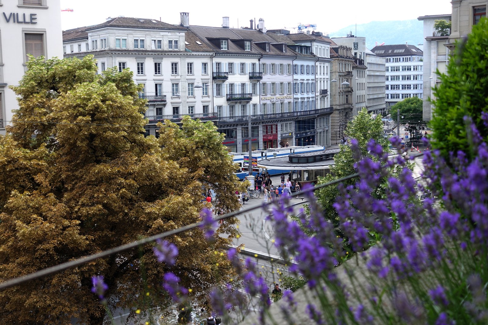 Wunderschöne Dachterrasse des Kaufhauses Grieder mit viel Grün und Blick auf den Paradeplatz. Perfekt geeignet für einen Kaffee oder Drinks. Auf der kleinen Karte stehen neben diversen Salaten, eine Tagespasta, Cheeseburger und Club Sandwich. Neben Kleinigkeiten zum Frühstück, gibt es eine Auswahl an Desserts und ab 15 Uhr Flammkuchen "Elsässer Art".