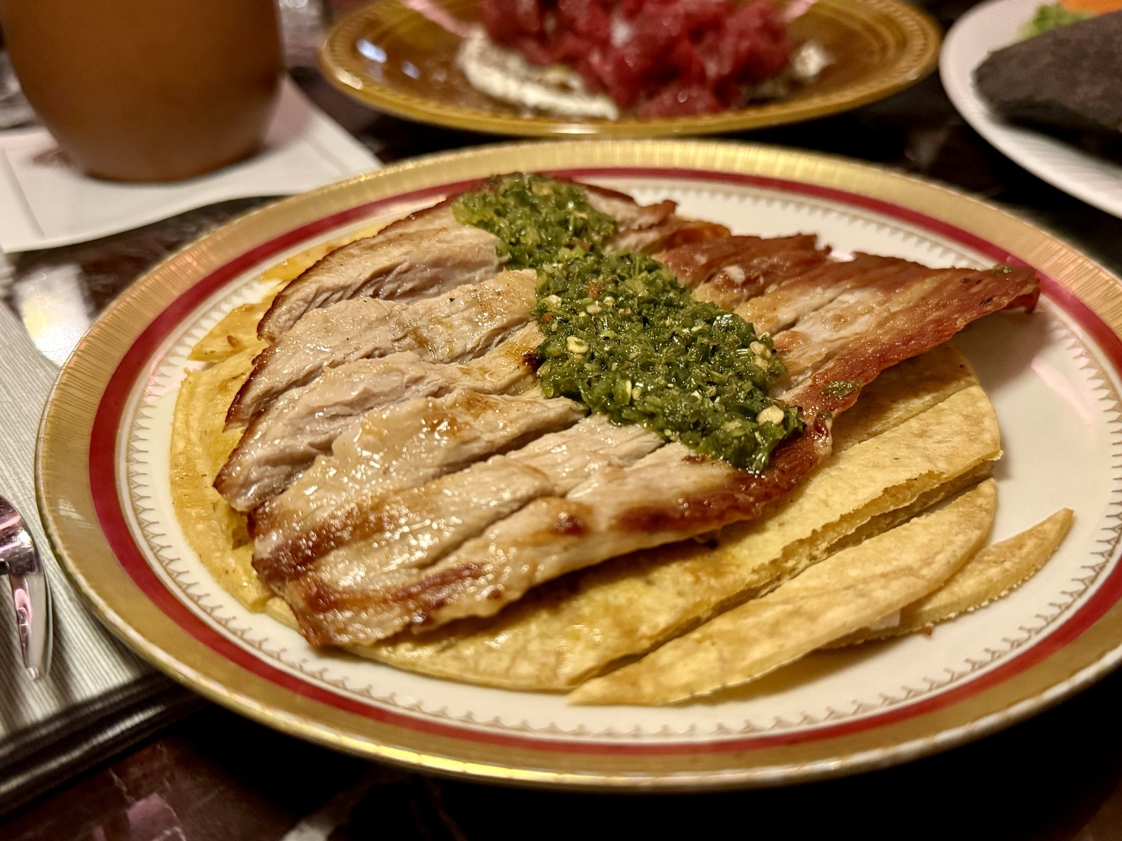 Secreto Ibérico, Quesadilla, Tatar und ein Drink mit shaved Eis