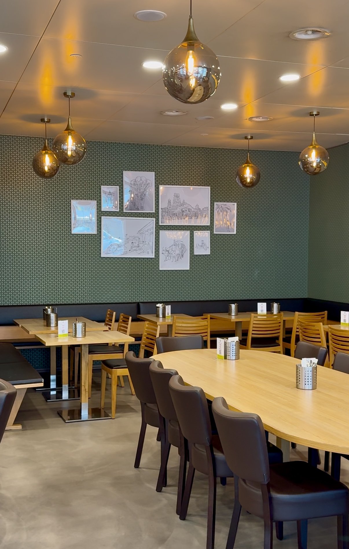 Gleich bei der Tramhaltestelle Museum für Gestaltung befindet sich das Restaurant. Das Restaurant ist recht gross und eignet sich auch für grössere Gruppen. Es ist schön eingerichtet in grün und goldenen Farbtönen mit liebevollen Details. Gleich beim Eingang gibt es ein Waschbecken, für alle die authentisch mit den Händen essen wollen.