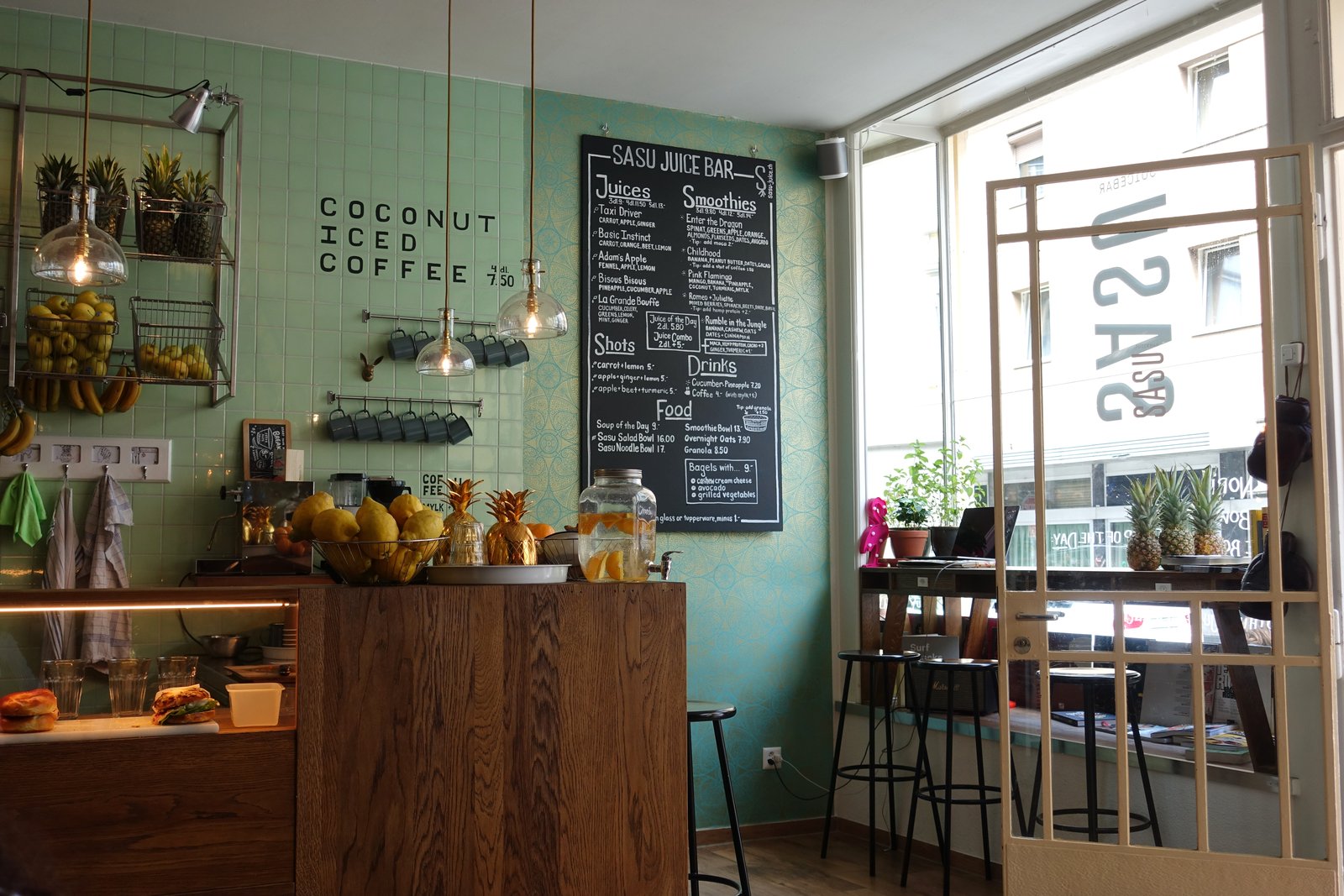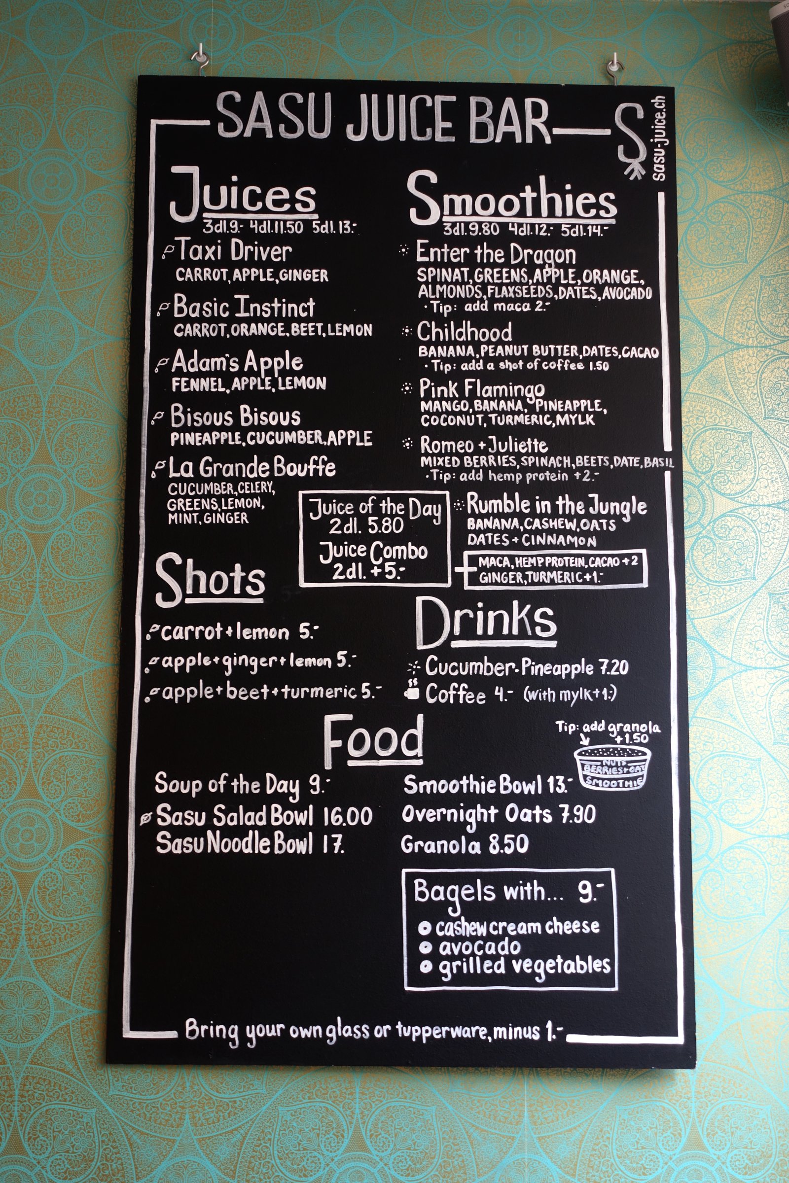 Sasu steht für frisch zubereitete Säfte und Smoothies, bietet aber auch Salate, Suppen, Sandwiches, Bowls und hausgemachte süsse Kleinigkeiten wie Powerballs oder Cheesecake an. Das Angebot ist komplett vegetarisch mit veganen Optionen. Es besteht die Möglichkeit ein 1 bis 7-tägiges Juice Abo für eine reinigende Saftkur abzuschliessen.