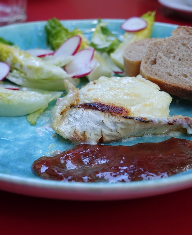 Chèvre chaud with rhubarb jam, followed by lemon cake