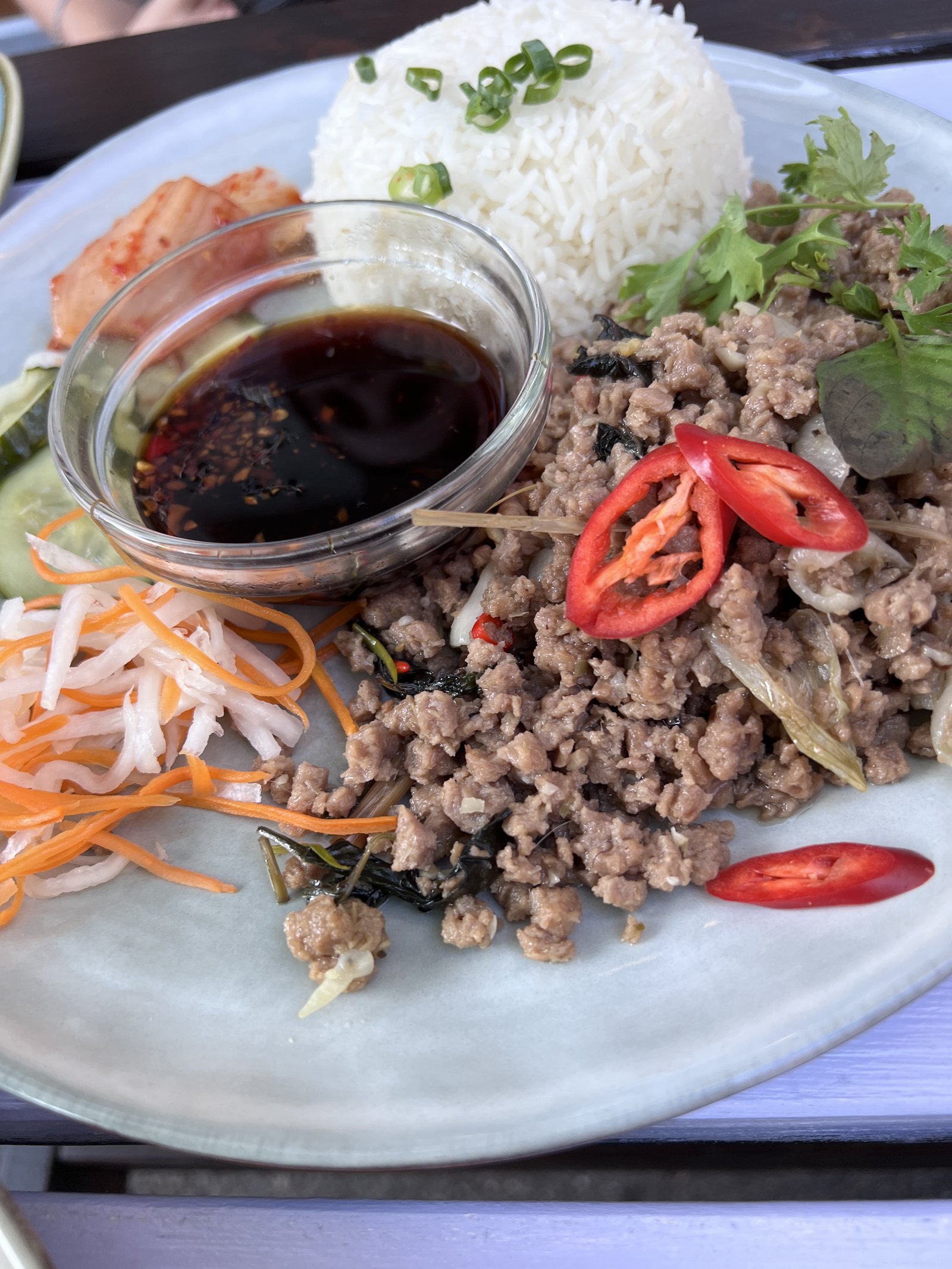 Spicy fake minced meat, rice, herbs, homemade kimchi, sesame cucumber & pickled carrots.