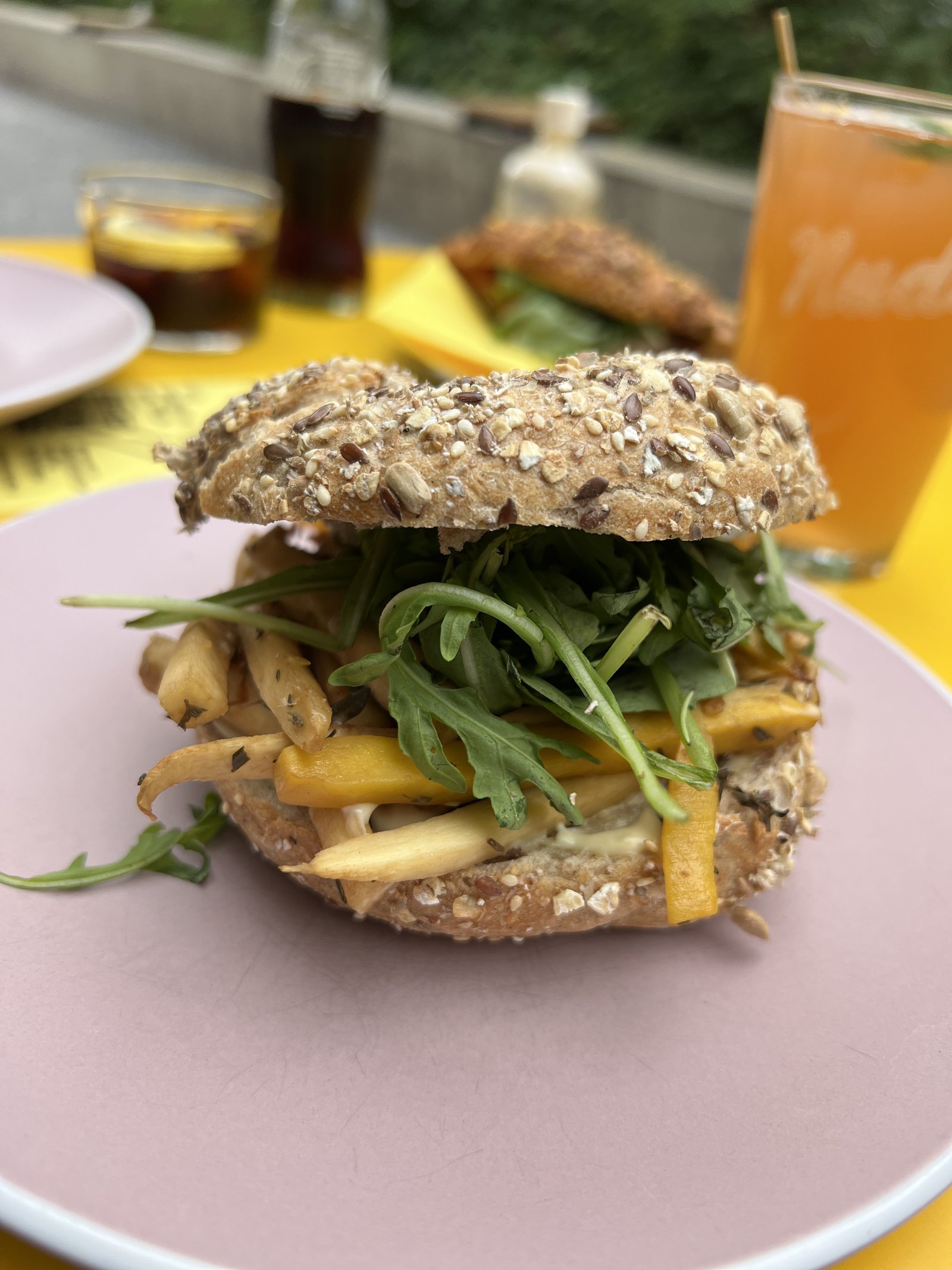 Carrot, parsnip, vegan hoisin mayo, roasted onion, arugula.