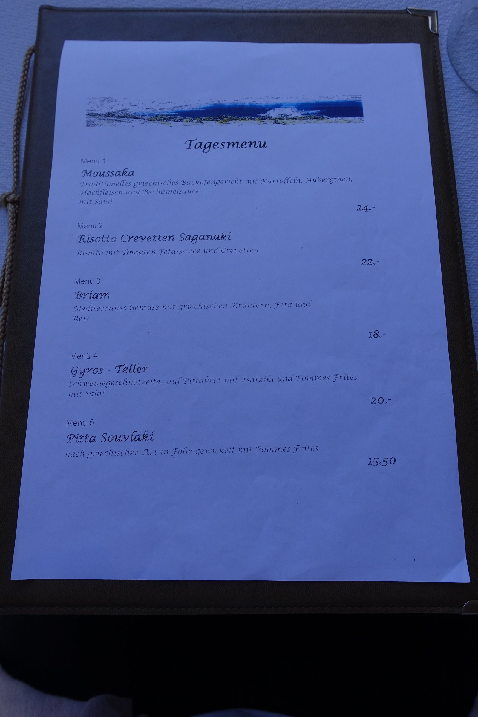 Fine Greek food is available at Tavernaki Kalymnos. Five different menus with meat, shrimps or vegetarian are available for lunch. Some menus are preceded by a small mixed salad. If you don't find what you are looking for, you can also order à la carte.