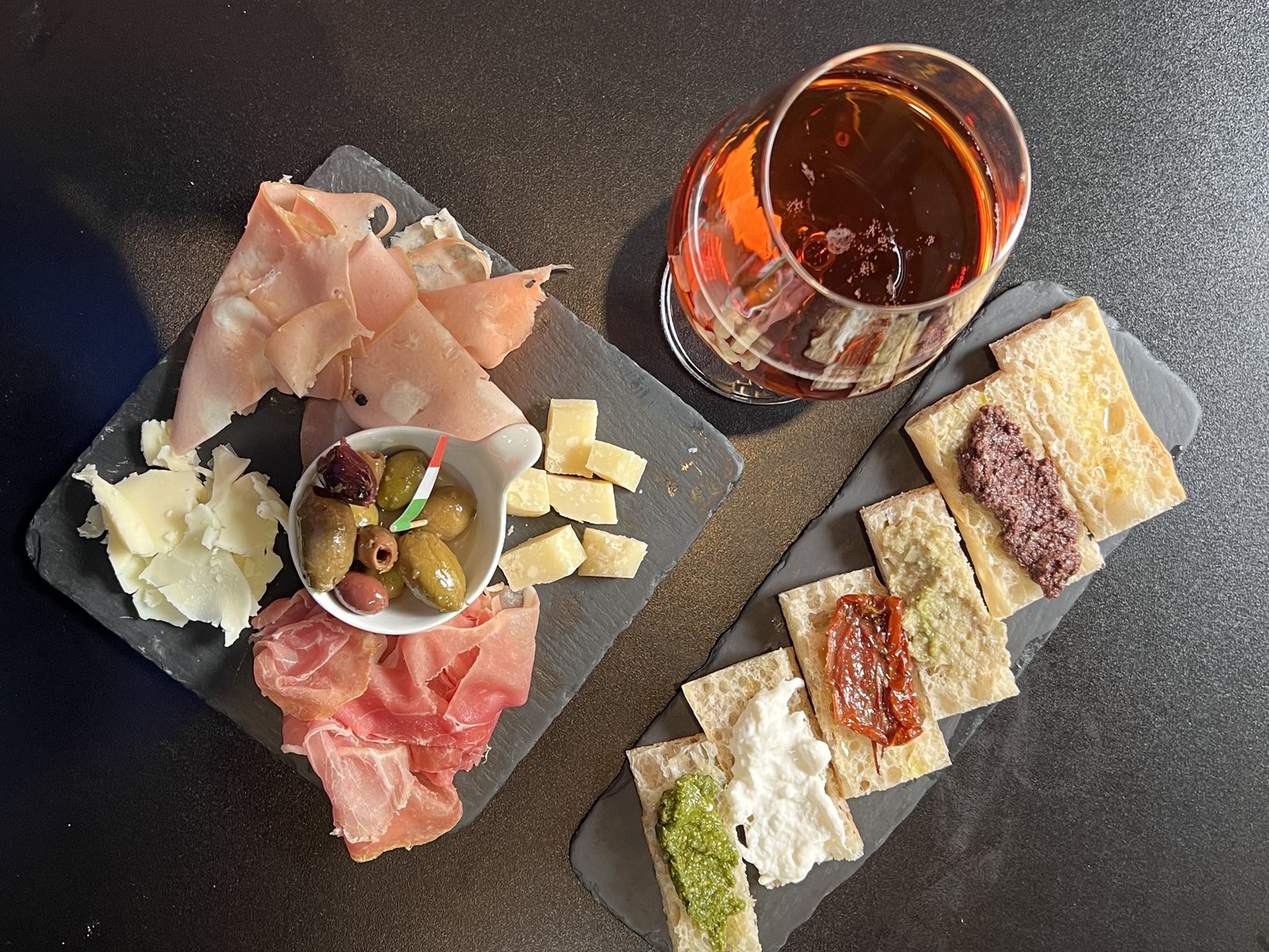 The typical Italian aperitivo is a speciality at Via del Gusto. You can choose between Aperol Spritz, red wine, white wine or Prosecco and receive a starter plate with salami/ham etc., cheese, olives and bread with various spreads. Each drink is accompanied by a snack. :)