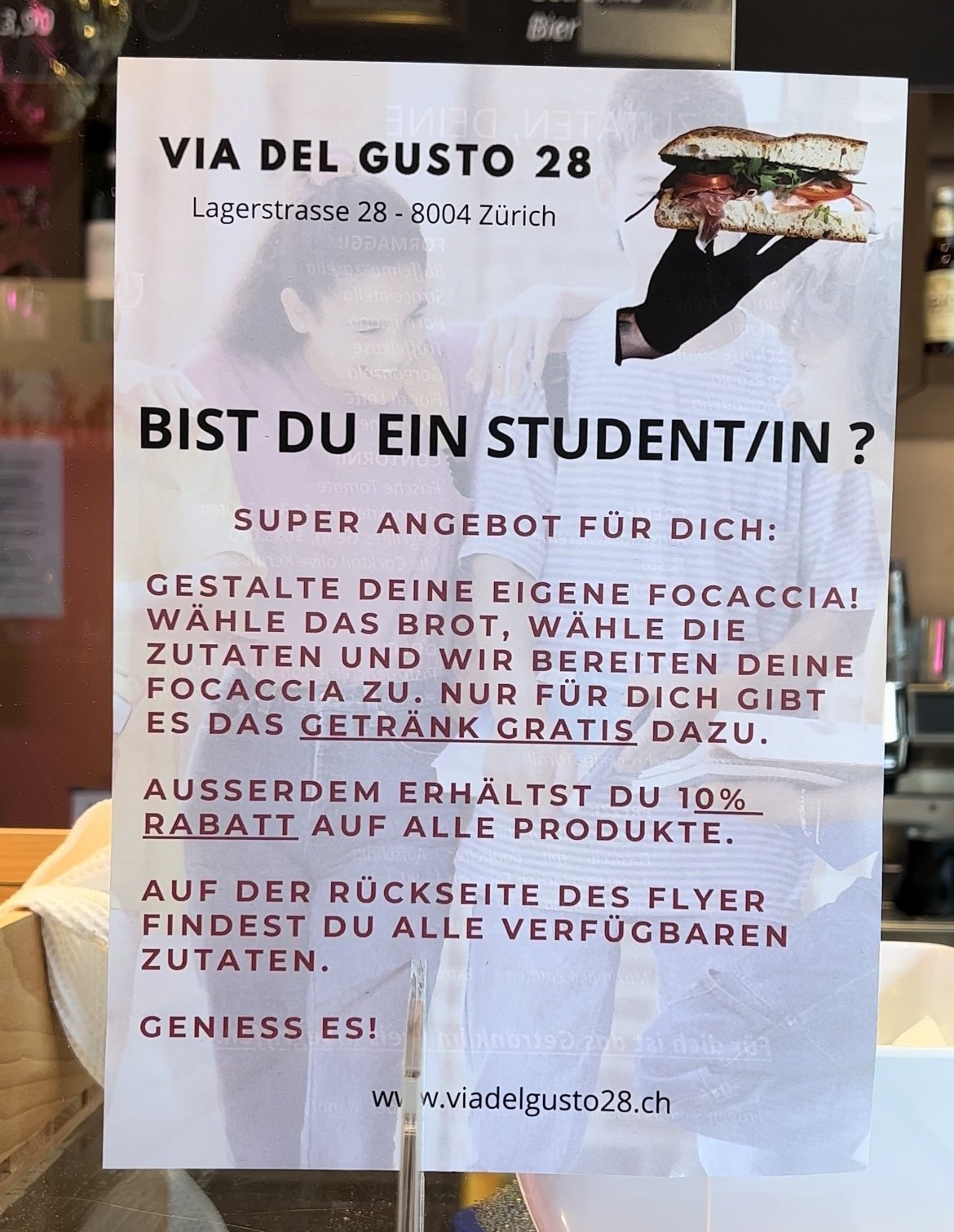 There is a large menu divided into focaccia, dolci and aperitivo. There are 13 different focaccia to choose from, two of which are sweet and the rest typically savoury. There is a good mix of vegetarian sandwiches, but above all with different types of ham and salami. Christian is also open to your own creations. The focaccia range in price from CHF 13.90 to CHF 17.90.