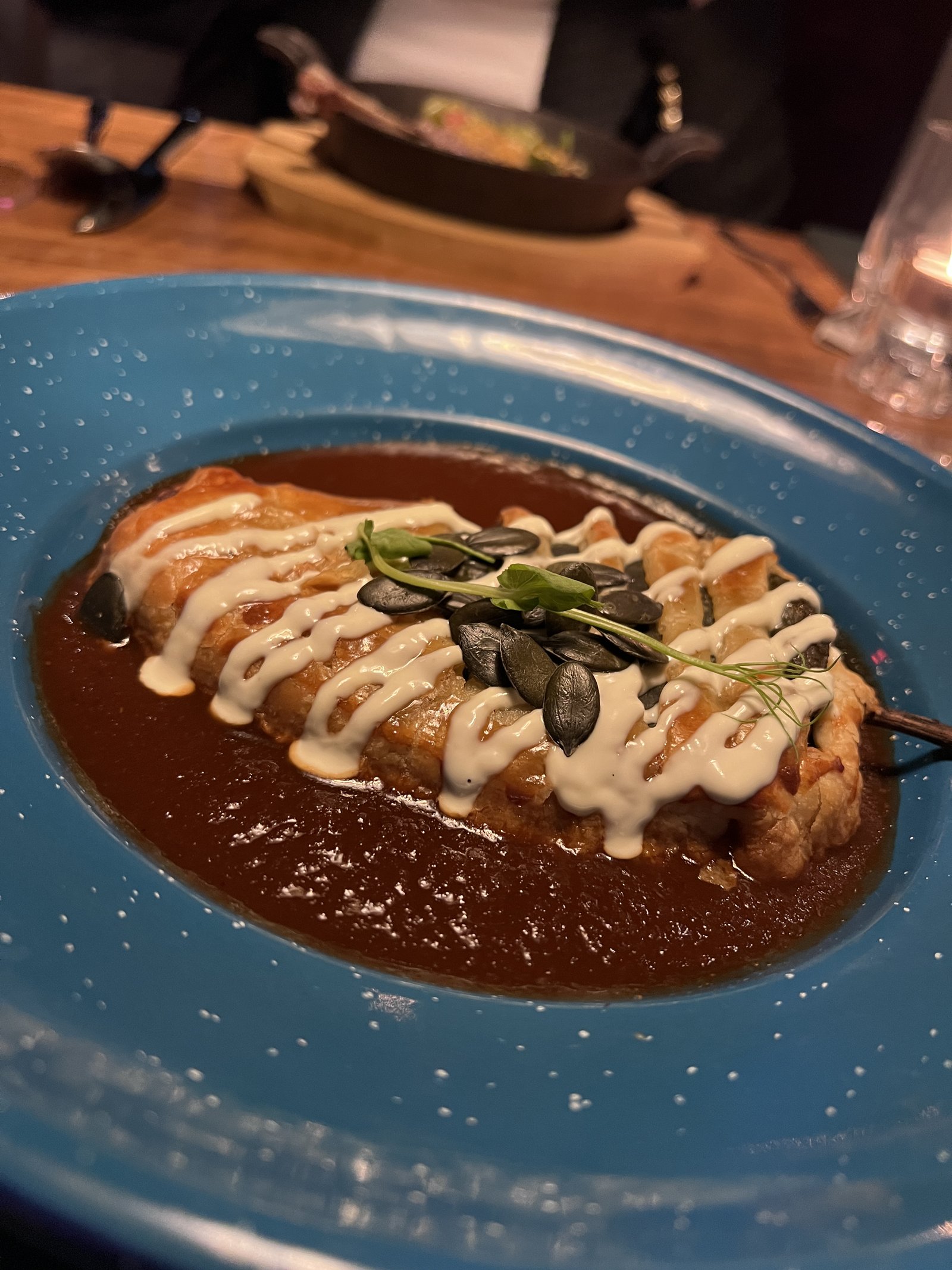 Chile Poblano gefüllt | Kartoffeln | Karotten | Erbsen | Bananen | getrocknete Rosinen | Zughetti | Schwarze Bohnen | Ummantelt mit Blätterteig Sauce: Tomaten | Chile Ancho | Epazote