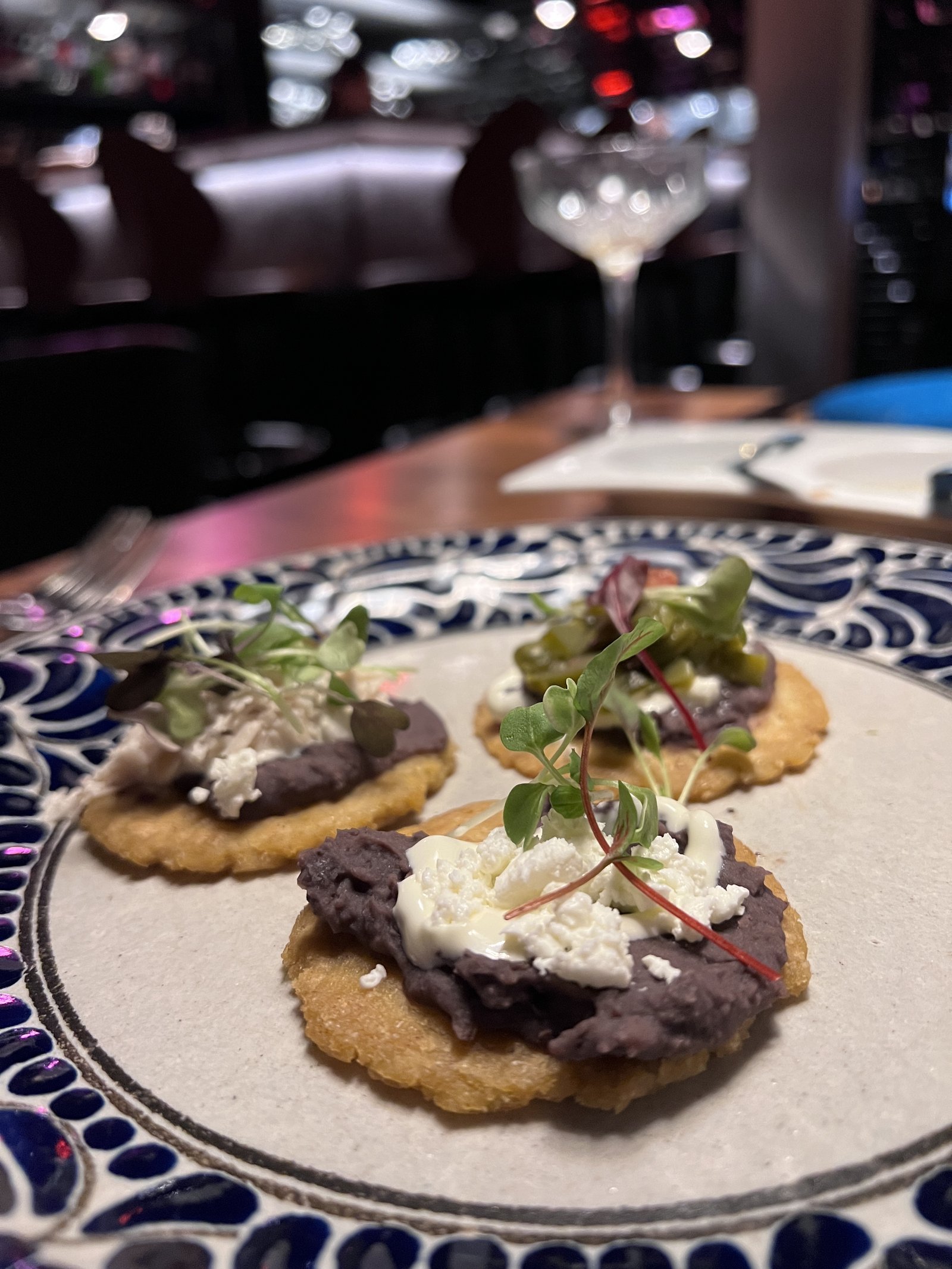 Je 1 Sopesito mit Bohnen, Poulet und Nopales | Crème Fraiche | Frischkäse | Mesclum Salat
