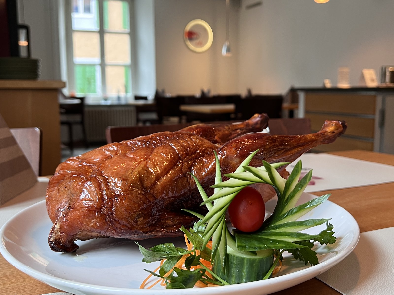 Peking Ente gibt's auf Vorbestellung und wird in mehreren Gängen traditionell serviert.