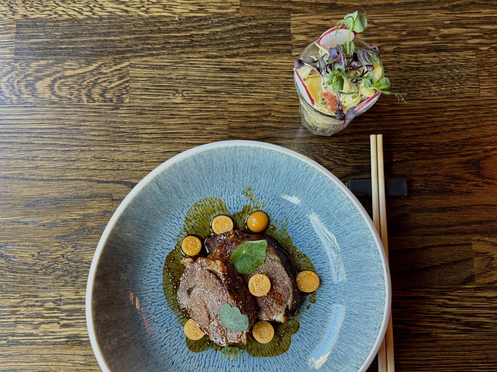 In the restaurant, a team serves hot Japanese dishes for lunch and dinner. Modern interpretations of innovative specialities from all regions of Japan are prepared with lightness and passion. At lunchtime, there is a selection of bento boxes, salads or gyoza, each served with miso soup. There is also a take-away menu.