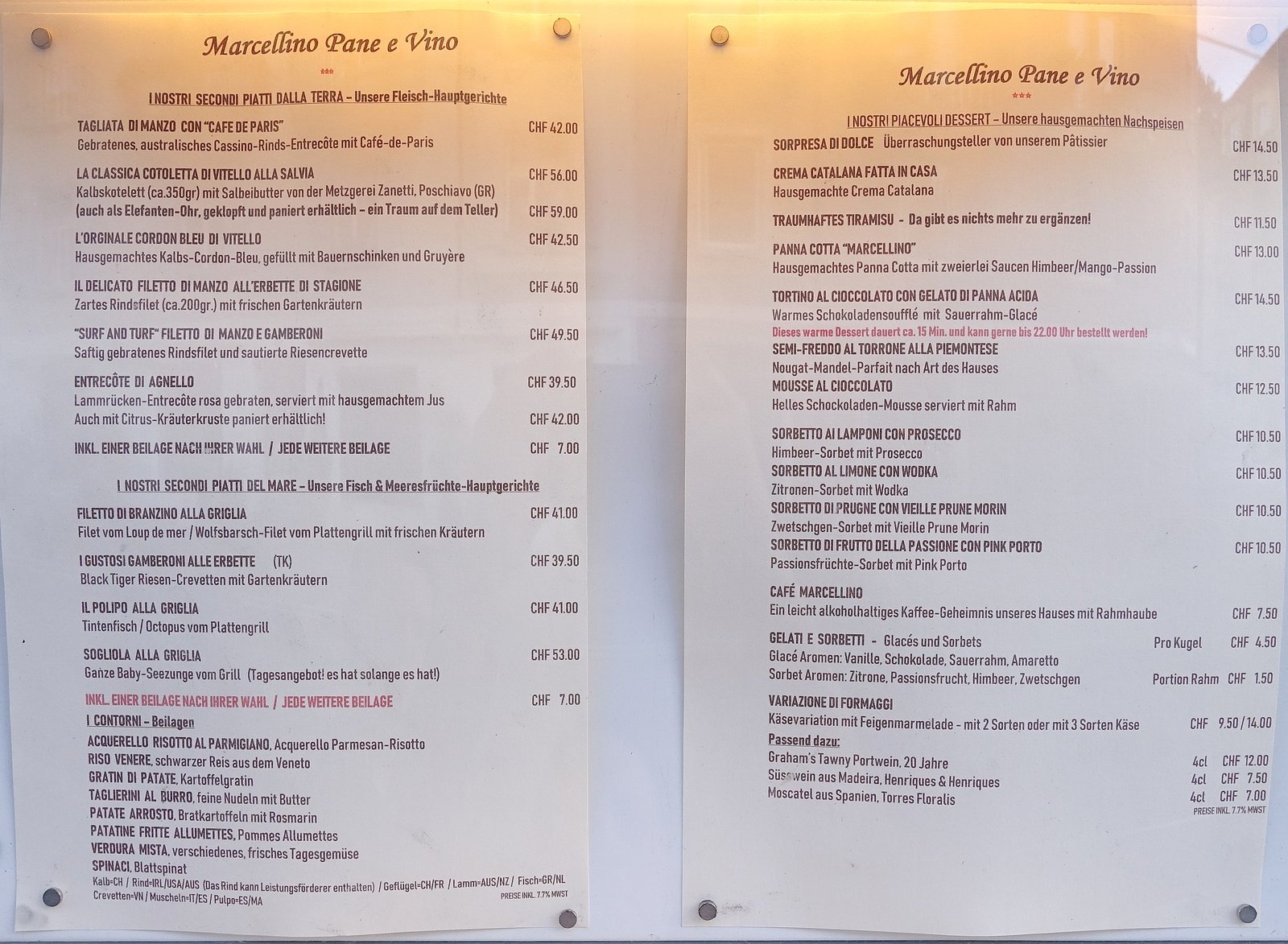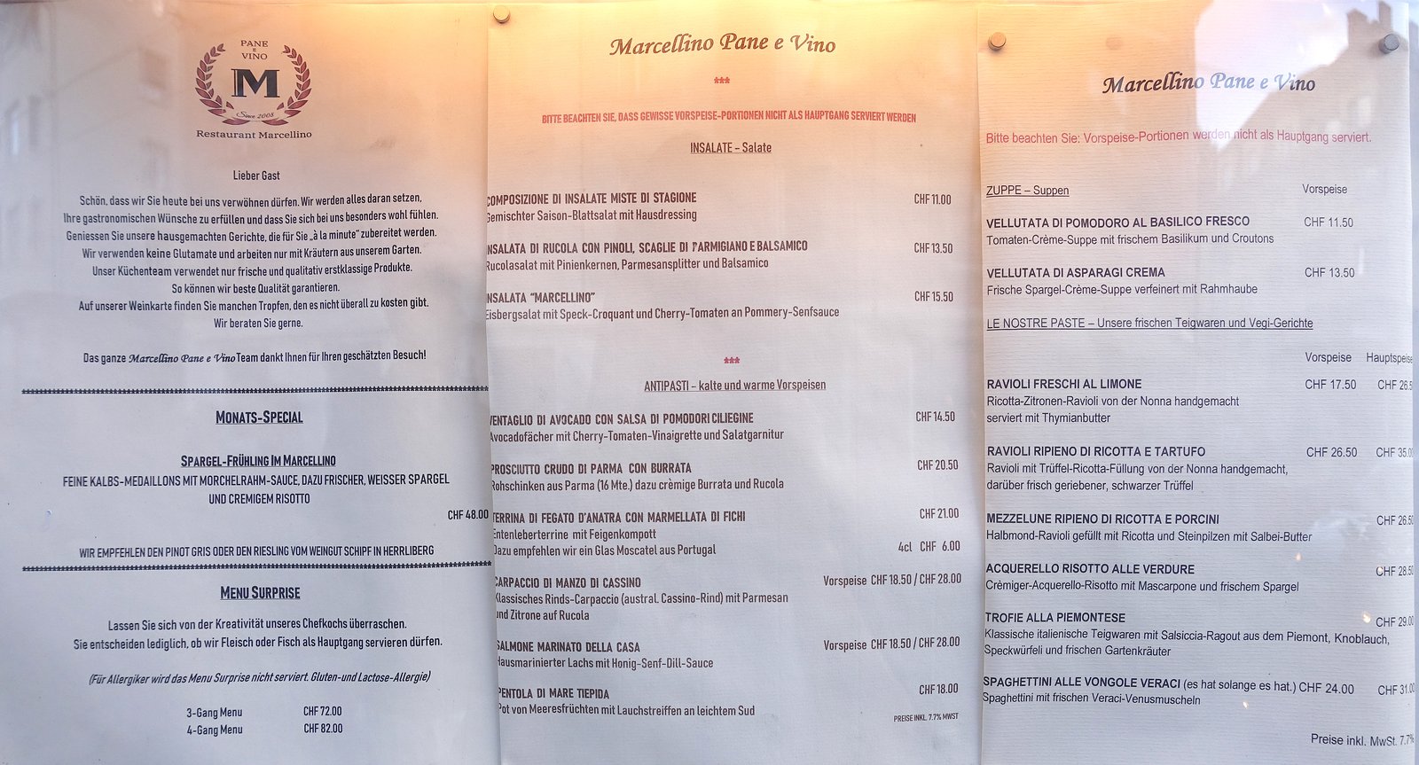 Marcellino Pane e Vino is one of the lesser known bijous of Italian gourmet cuisine in Zurich. The restaurant is small and fine, the service is very pleasant and in summer you can sit outside. The owner deliberately refrains from having his own website. Probably the restaurant should be spared from large tourist masses.