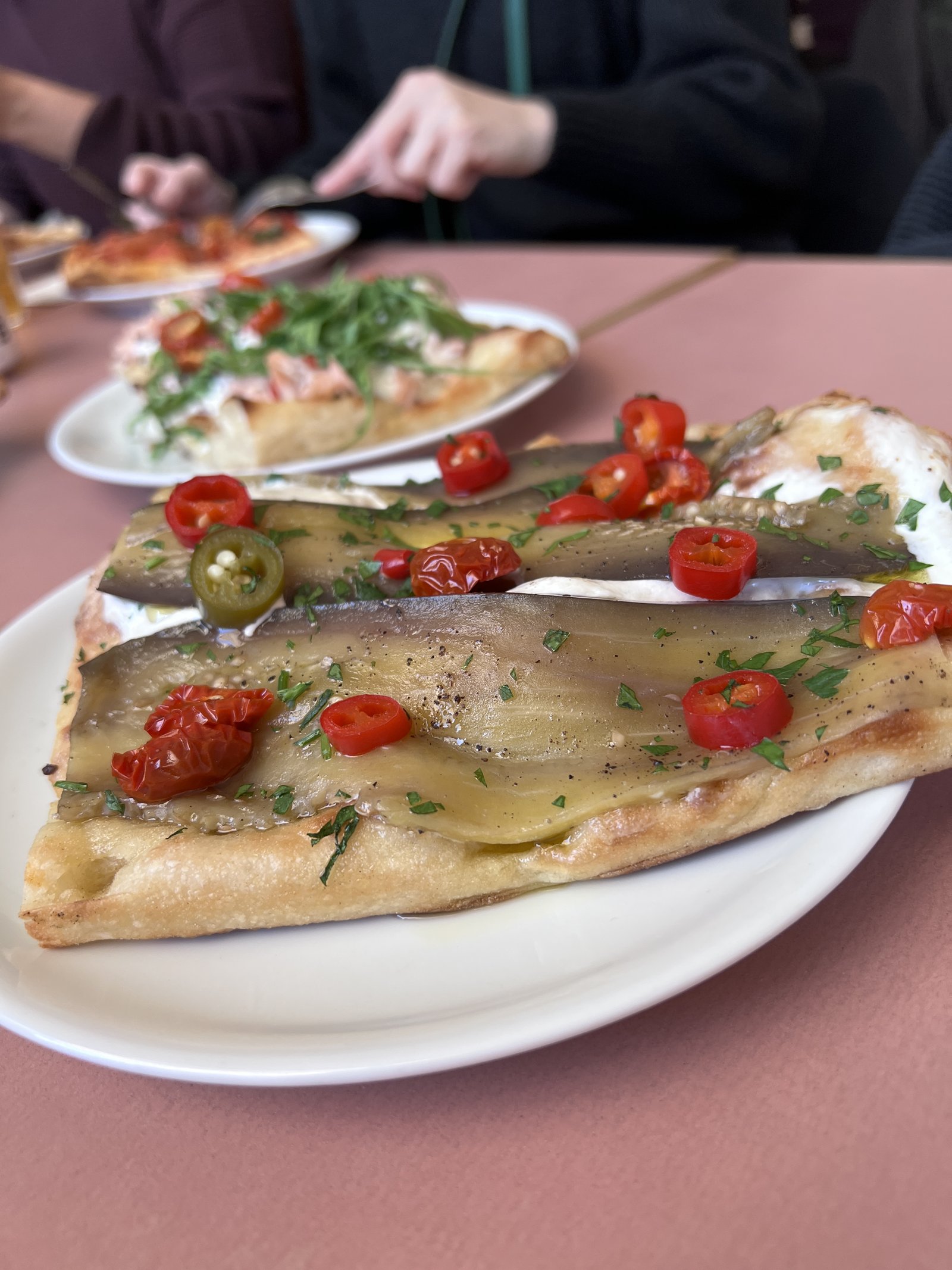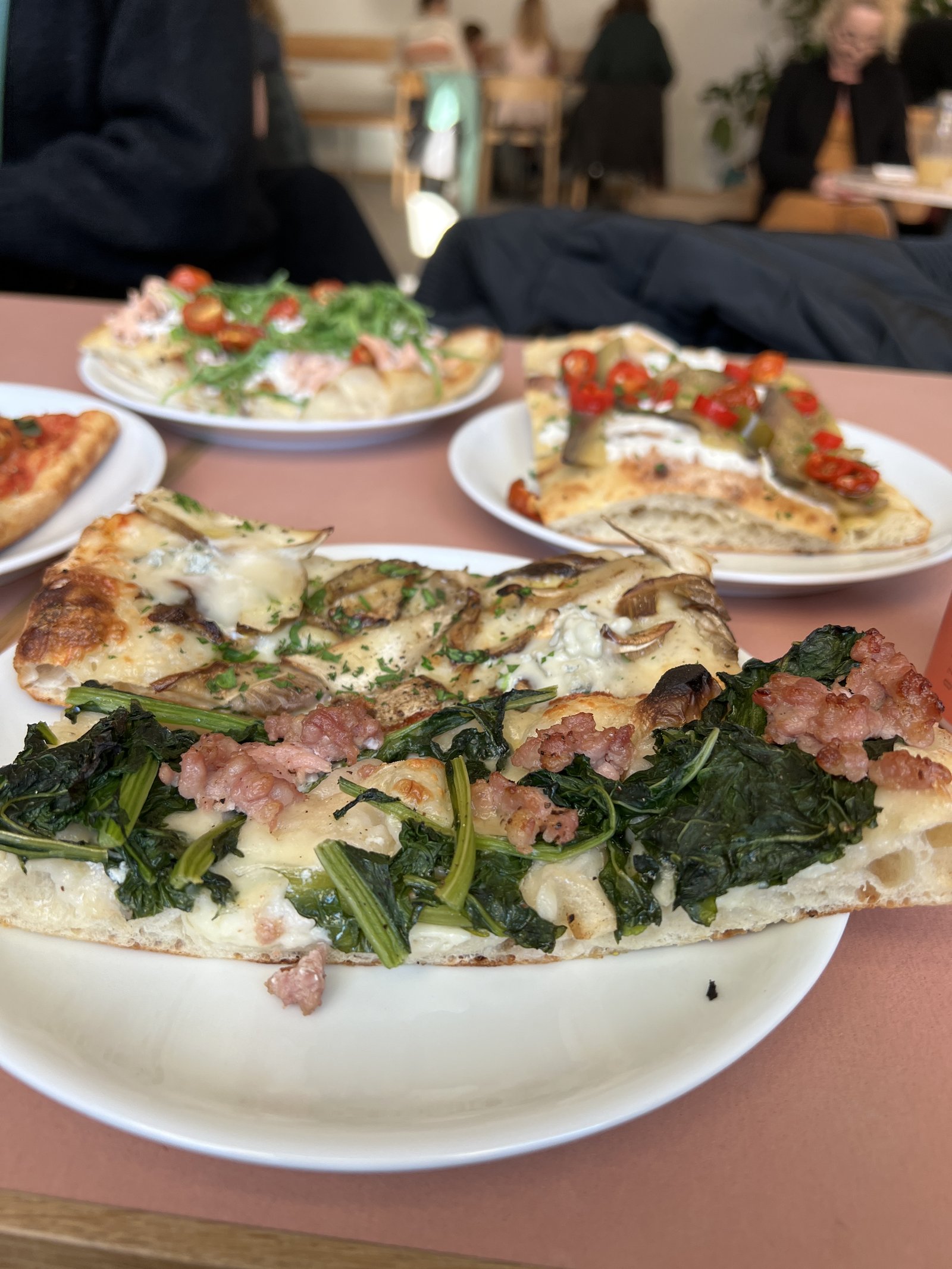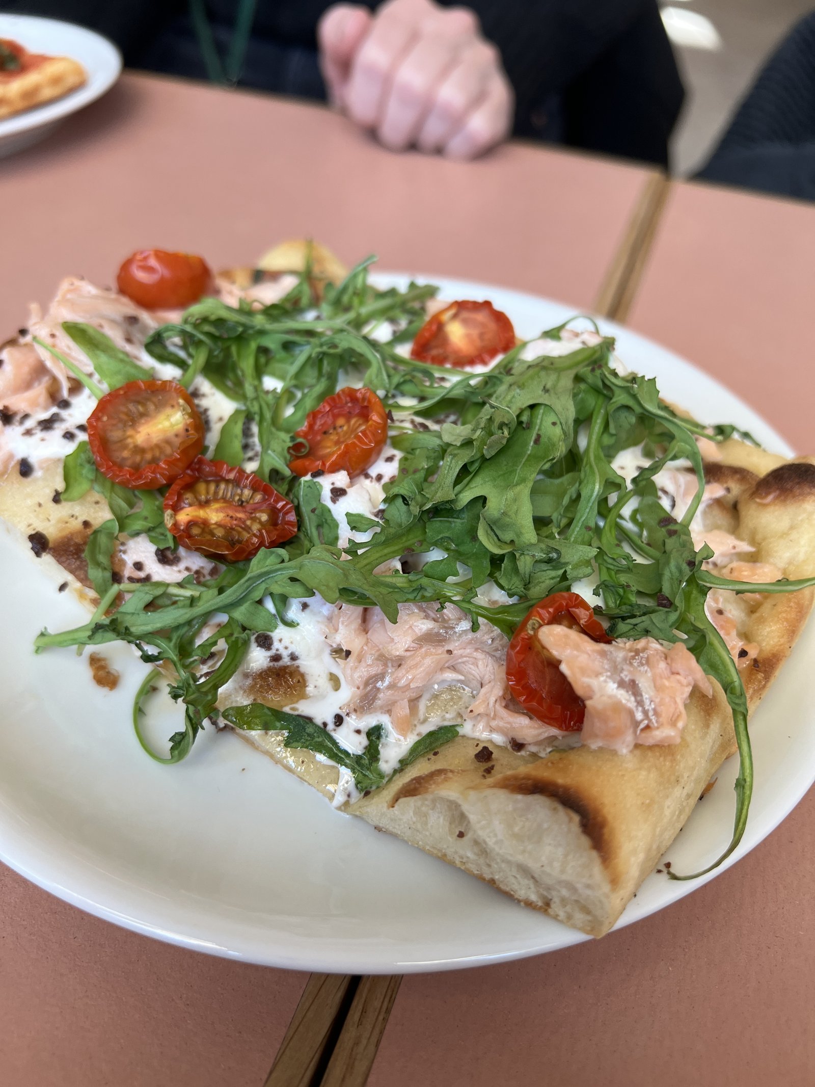 🍕 Pizza al taglio or Roman pizza in various varieties is available at the restaurant Modo. You can watch the production and then choose your pieces at the counter - there are two different sizes available. Margherita, marinara, salame piccante and cotto are available daily, the rest of the 10 or so varieties are seasonal daily specials.