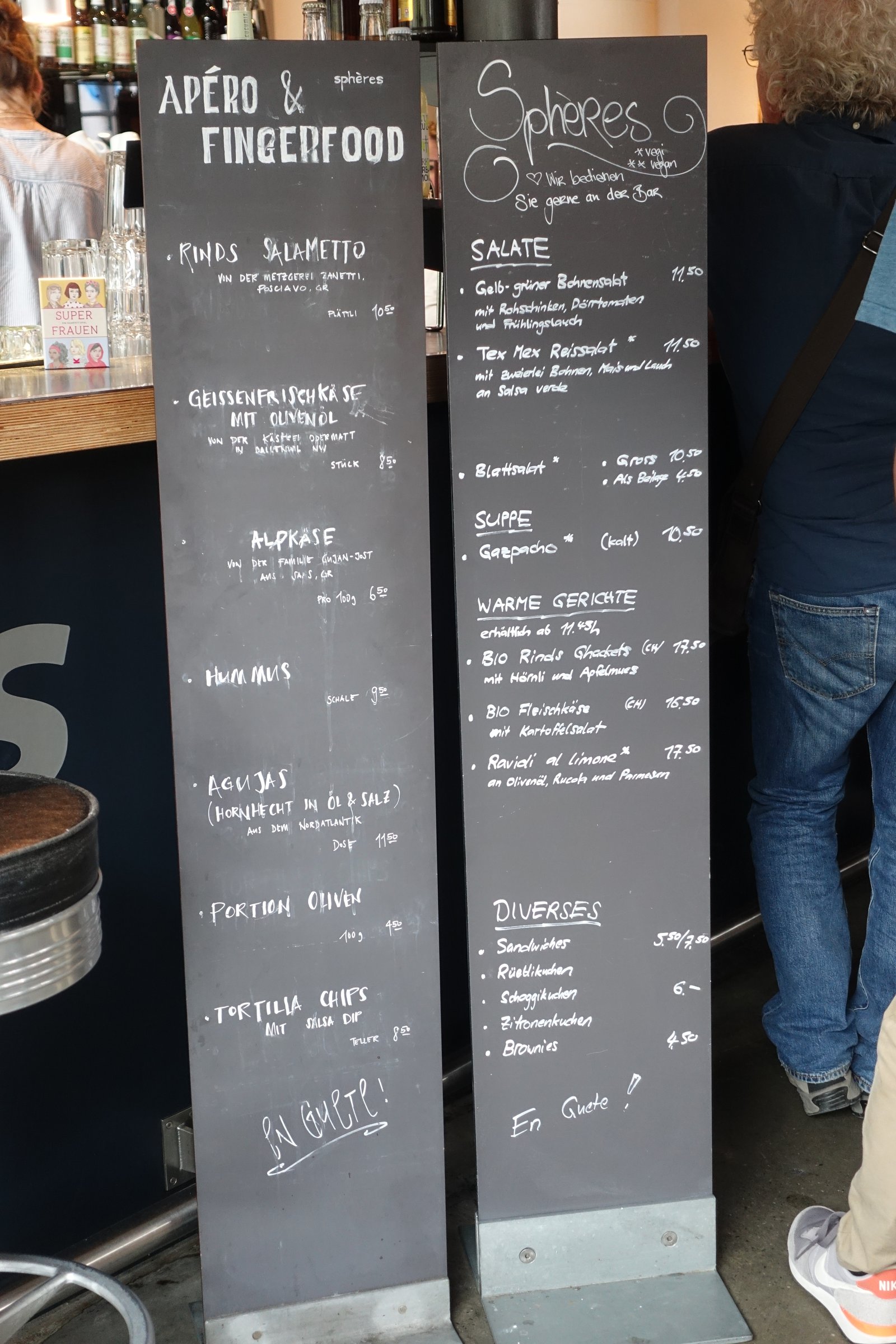 The Sphères is bar, bookstore and stage in one. An extraordinary place in District 4 for a coffee with friends, a small lunch or an after-work beer or birthday party in a relaxed atmosphere. In the morning there are fine butter peaks, in the afternoon a small meal (soup & salad and fine sandwiches), in the afternoon cake/ slice/ glacé and for the aperitif time and beyond that the Tapas-Plättli.